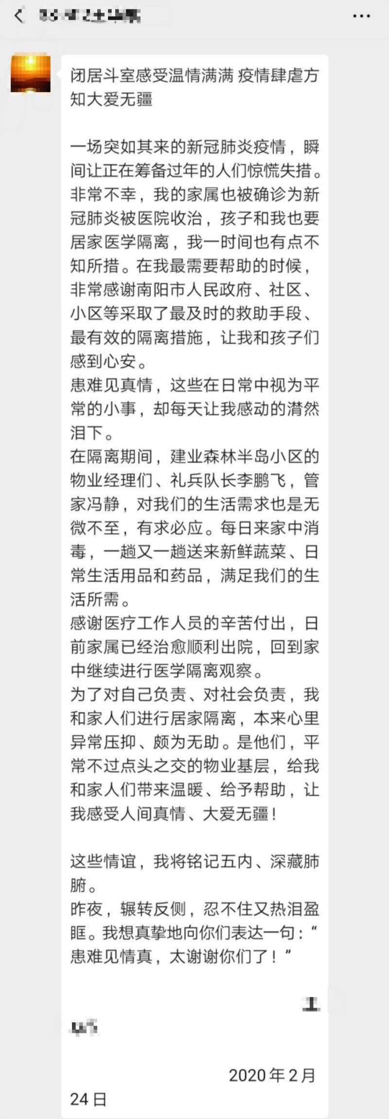 “非常不幸,我的家屬被確診為新冠肺炎,一時間我和家人不知所措。在我最需要幫助的時候,南陽市人民政府、社區(qū)、小區(qū)物業(yè)采取了最及時的救助手段和最有效的隔離措施,讓我和孩子們感到心安。